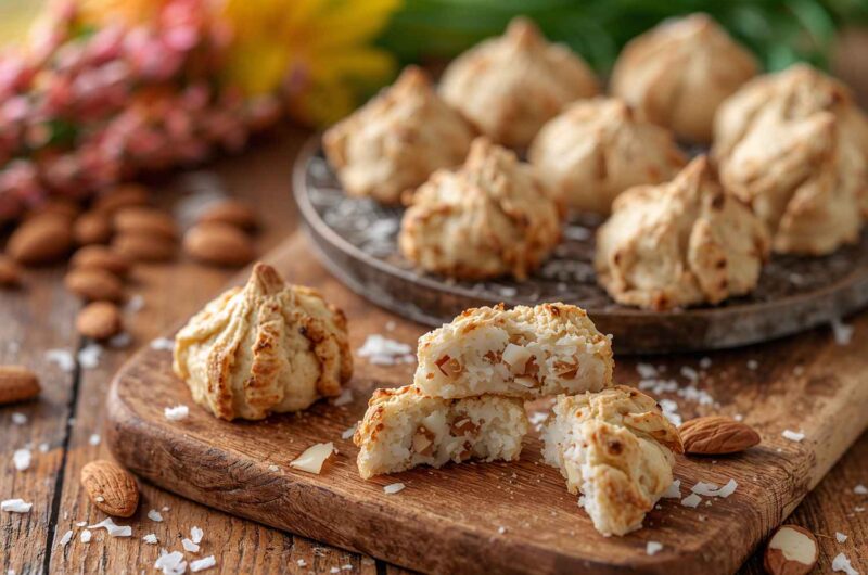 - Form Macaroons: Scoop 1–2 tbsp of the mixture and shape into small mounds on prepared baking sheets. Press one whole almond on top of each mound.