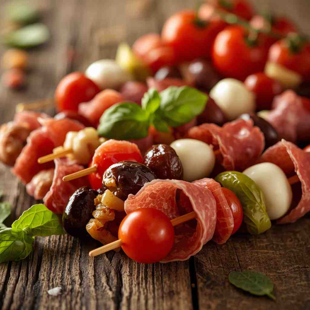• Arrange the Skewers: Start threading ingredients onto the skewers. A classic pattern might be: cherry tomato → basil leaf → salami (folded) → mozzarella ball → olive → artichoke heart.