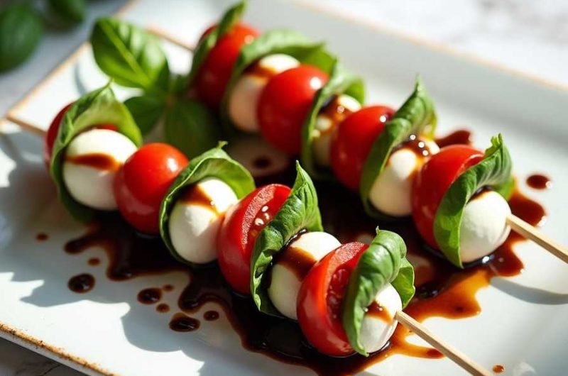 I love this recipe because it is simple, fresh, and versatile. The combination of ripe tomatoes, soft mozzarella, and aromatic basil is a classic that never disappoints. The balsamic glaze adds a sweet tang that elevates the flavors, while the skewer presentation makes it easy to serve and enjoy. It’s quick to assemble, visually stunning, and perfect for entertaining or a light, refreshing snack.
