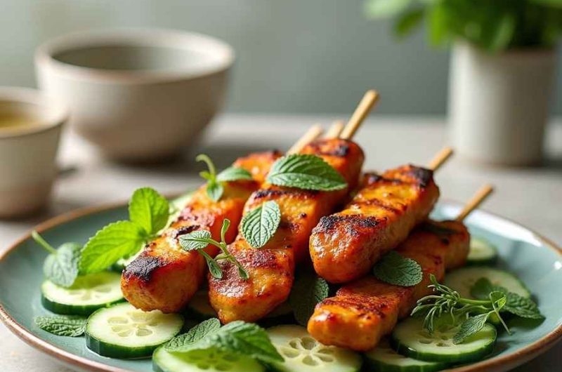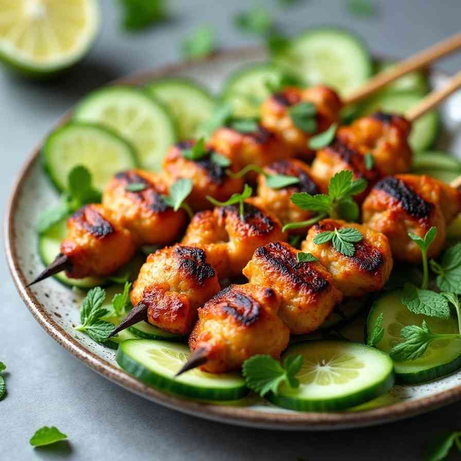 Marinate chicken for at least 1 hour or overnight for maximum flavor. Soak wooden skewers to prevent burning during cooking. Cook chicken evenly by not overcrowding the grill or pan. Adjust chili in the cucumber salad to your preferred spice level. Serve immediately for best texture and flavor.