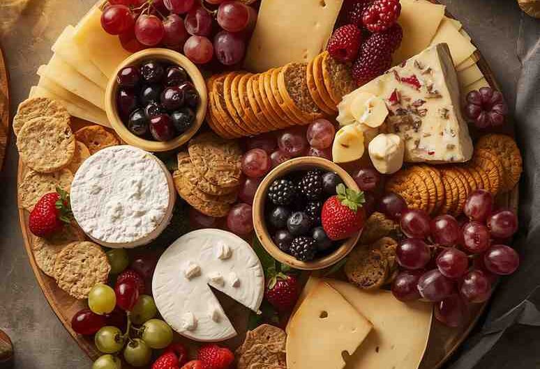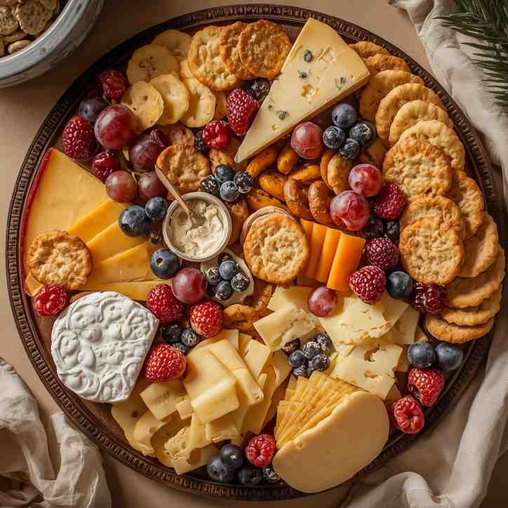 - Assemble the Platter: Arrange cheeses with space in between and fill gaps with fruits, nuts, and crackers.