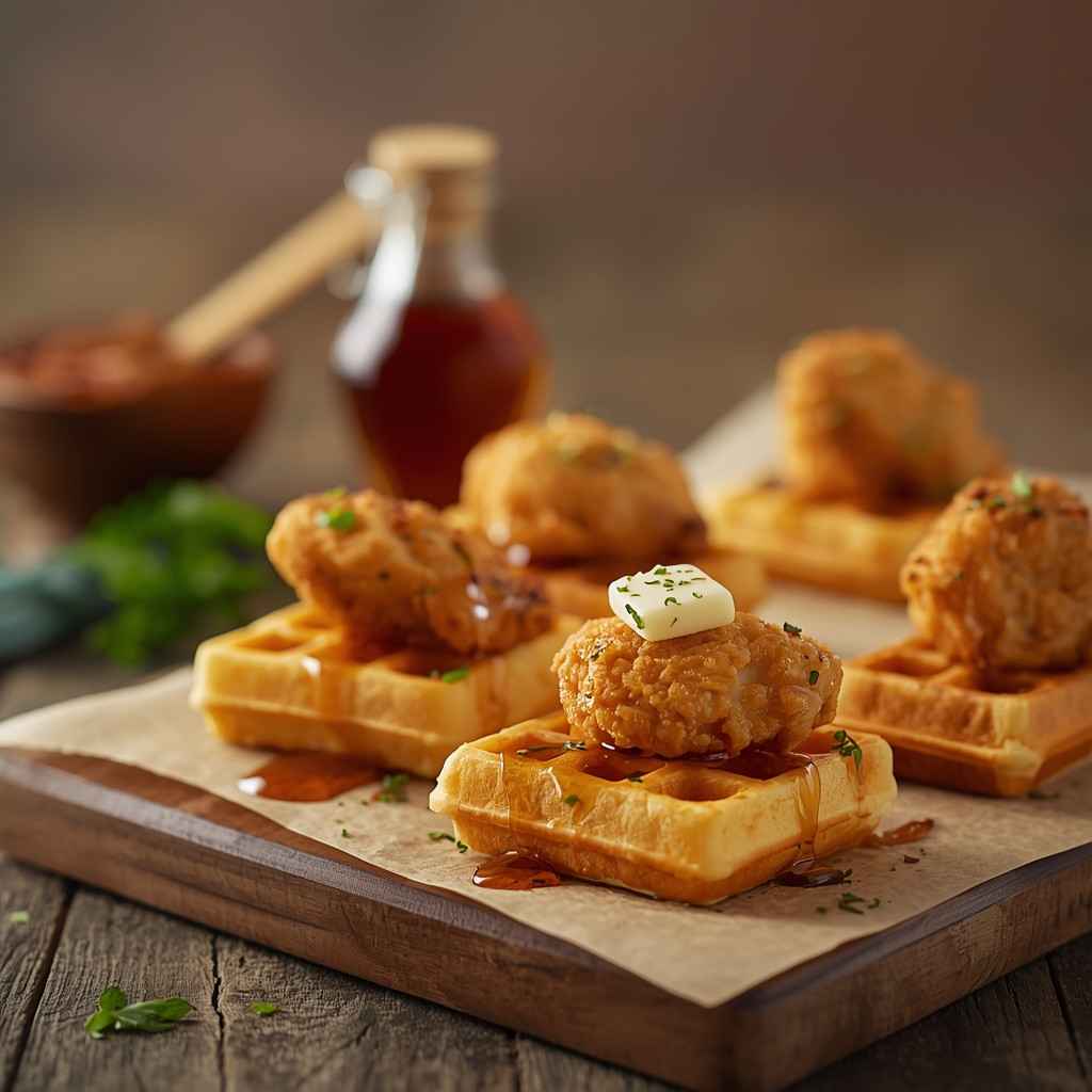 - Step 4: Assemble Bites : Place a fried chicken piece on top of each mini waffle. Secure with a toothpick if needed. Drizzle with maple syrup or honey.