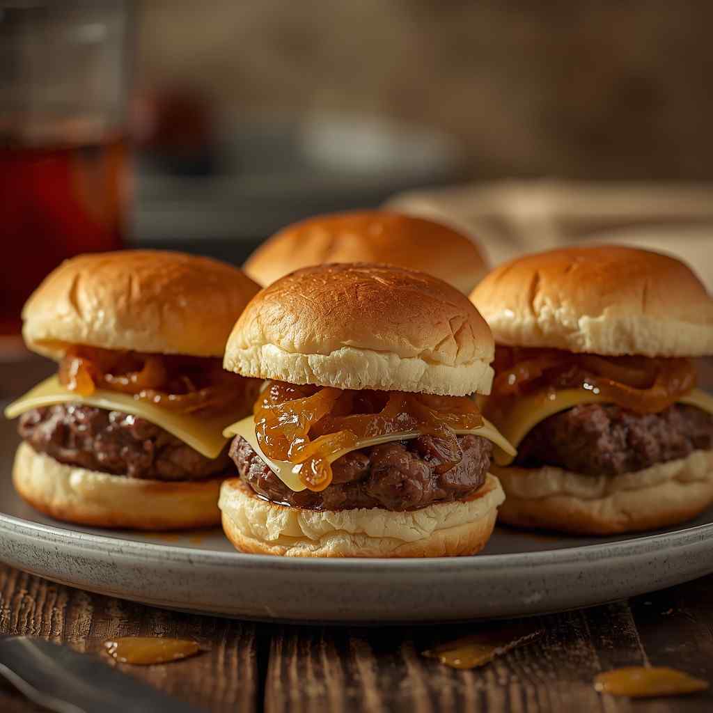 - Assemble sliders by placing the patty on the bun bottom, topping with caramelized onions, and covering with the bun top.