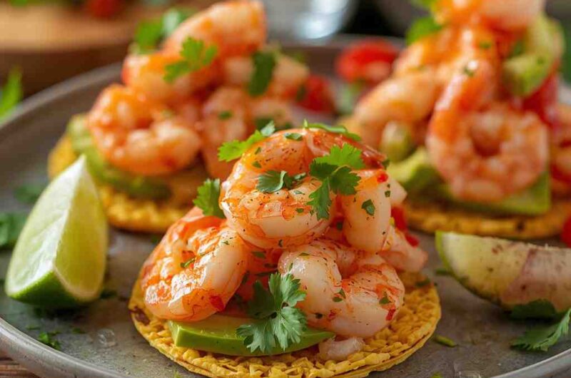 Shrimp Ceviche Tostadas with Avocado is a bright, refreshing, and zesty seafood dish that’s perfect for warm-weather dining or light, flavorful meals. This dish combines tender shrimp “cooked” in lime juice, tossed with fresh tomatoes, onions, cilantro, and jalapeños, then served on crispy tostadas with creamy slices of ripe avocado.