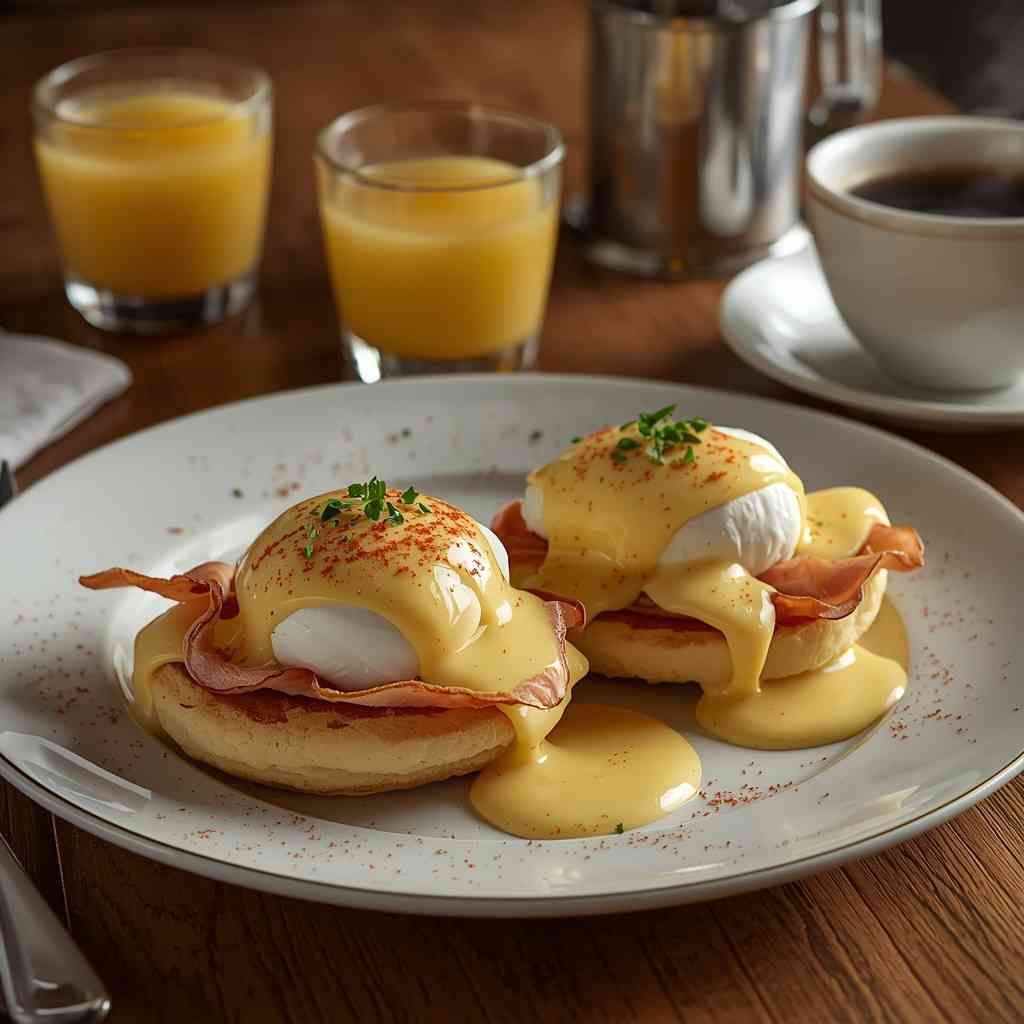 • Step 5: Assemble the Eggs Benedict : Place cooked bacon on toasted muffins. Top each with a poached egg. Drizzle Hollandaise sauce generously over eggs. Garnish with chopped chives or parsley and a pinch of paprika.