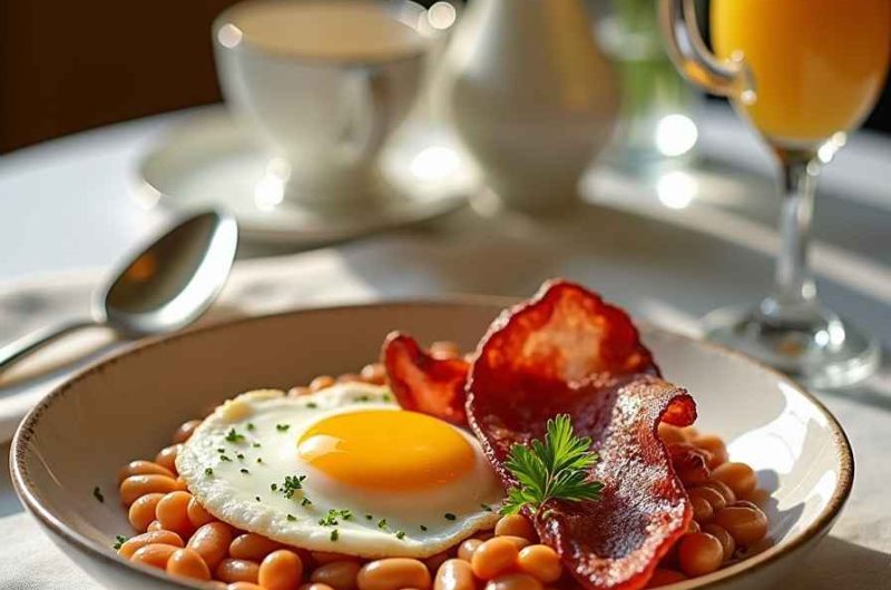 English Breakfast with Eggs, Bacon, and Beans is a timeless, hearty, and satisfying meal that combines rich flavors, textures, and nutrients. Perfect for weekends, special brunches, or an indulgent morning, this breakfast delivers the classic British experience in a single plate. Crispy bacon, creamy eggs, warm beans, and toasted bread come together to create a filling, comforting, and delicious start to any day.