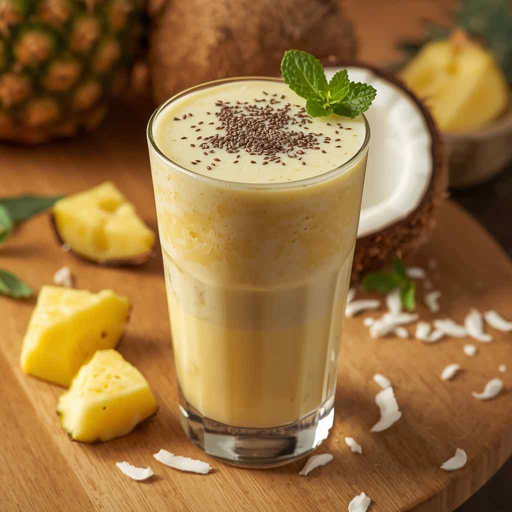 The Pineapple Coconut Smoothie with Chia Seeds is a tropical escape in a glass — creamy, refreshing, and packed with nourishing ingredients. With the sweet tang of pineapple, the creamy richness of coconut milk, and the subtle crunch of chia seeds, this smoothie tastes like sunshine and feels like a mini vacation.