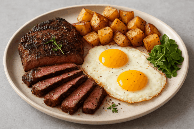It’s also highly customizable—you can cook the steak to your preferred doneness and choose your favorite style of eggs, whether scrambled, fried, or poached. Plus, pairing it with sides like roasted potatoes, toast, or avocado makes it endlessly versatile.