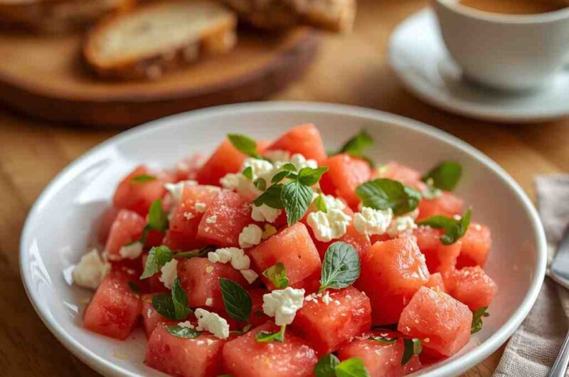The Watermelon, Mint, and Feta Breakfast Salad is a refreshing, vibrant dish that perfectly captures the essence of summer mornings. Sweet, juicy watermelon pairs beautifully with the salty creaminess of feta cheese, while fresh mint leaves add a cooling herbal note that brightens every bite. Drizzled with a hint of lime juice and olive oil, this salad is light, hydrating, and full of life.