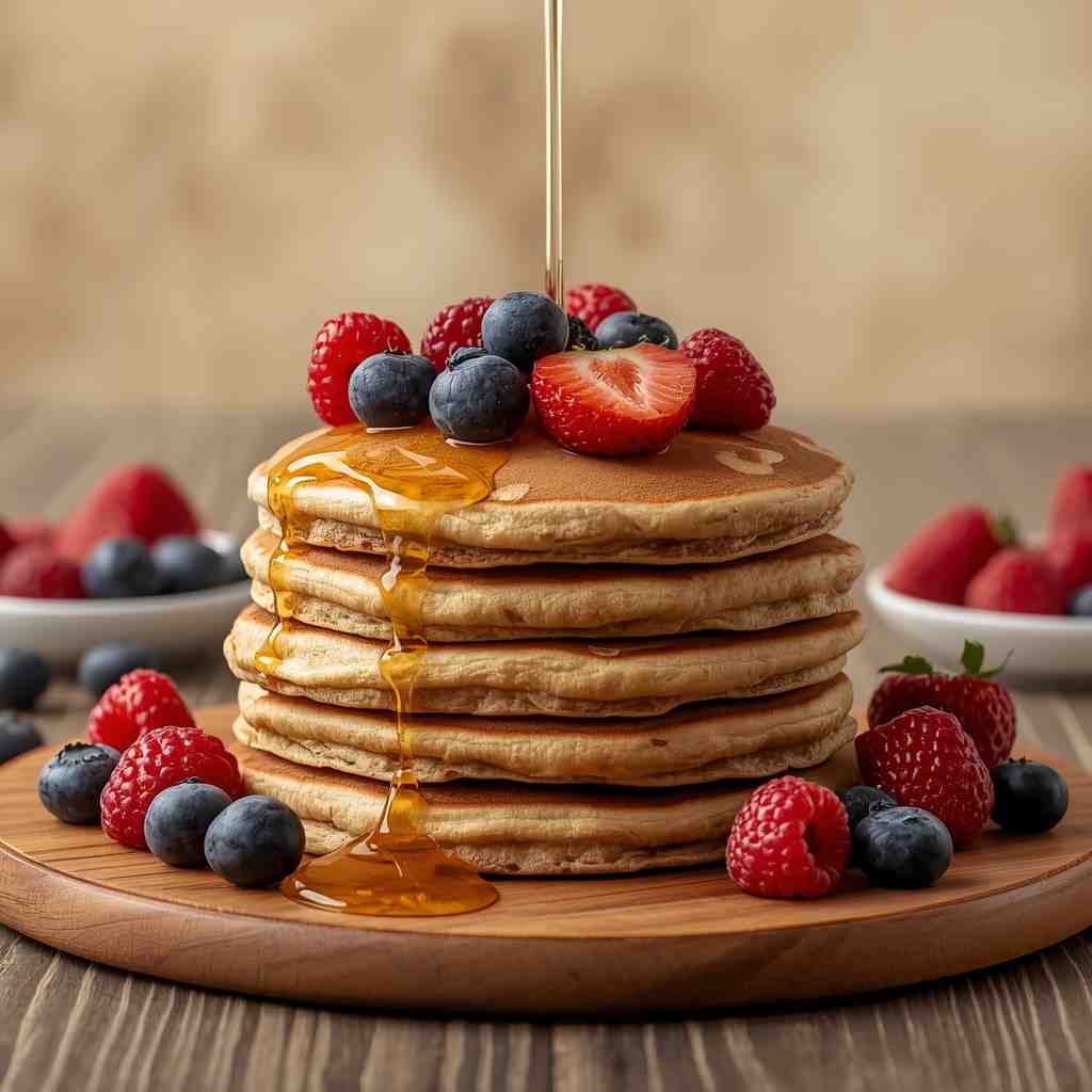 Whole Wheat Pancakes with Honey and Berries are a wholesome and delicious breakfast option that combines the nutty flavor of whole wheat with the natural sweetness of honey and fresh, juicy berries. These pancakes are light yet filling, providing sustained energy to start the day.