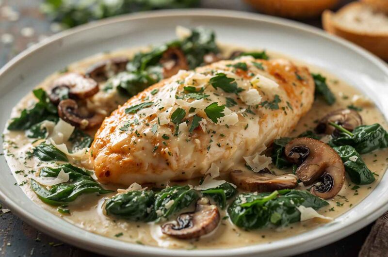Creamy Garlic Parmesan Chicken with Spinach and Mushrooms is the definition of comfort food. Juicy chicken breasts are seared to golden perfection, then simmered in a rich, velvety garlic-Parmesan sauce with earthy mushrooms and tender spinach. The result? A dish that feels indulgent yet wholesome, balancing creaminess with fresh vegetables and protein-packed chicken.