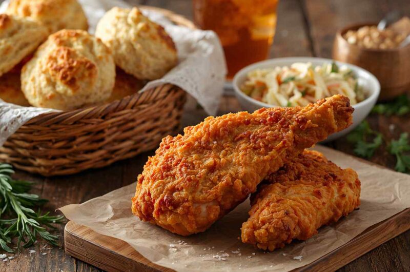 Few dishes embody Southern comfort food better than crispy buttermilk fried chicken served with warm, flaky homemade biscuits. This meal is all about indulgence: golden-brown chicken with a crackly crust that gives way to tender, juicy meat, paired with biscuits that are buttery, soft on the inside, and slightly crisp on the edges.