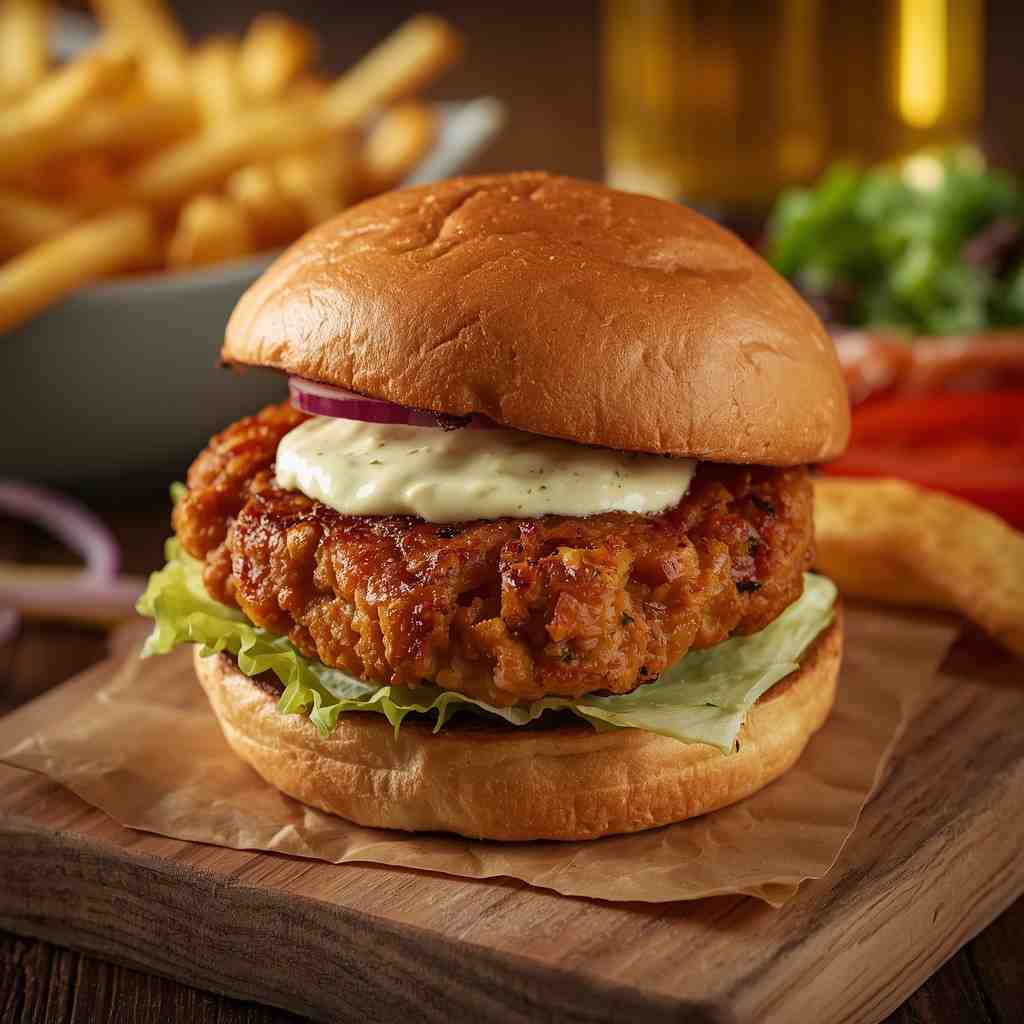 - Step 5: Assemble the Burgers : Toast buns lightly in a skillet or toaster for extra flavor. Spread garlic aioli generously on both the top and bottom bun. Layer with lettuce, crispy chicken, tomato slices, pickles, and red onions if desired. Top with the other half of the bun. Serve hot and enjoy the crunch!