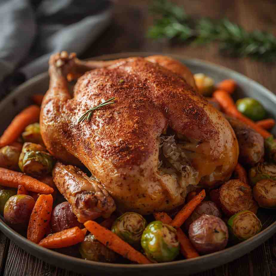 Smoked Paprika Roast Chicken with Root Vegetables is a rustic, flavorful dish that combines succulent roasted chicken with earthy root vegetables like carrots, potatoes, and parsnips. The chicken is seasoned with smoked paprika, garlic, and herbs, giving it a warm, smoky flavor with a golden, crispy skin. The root vegetables roast alongside the chicken, soaking up the juices and spices for a perfectly harmonious meal.