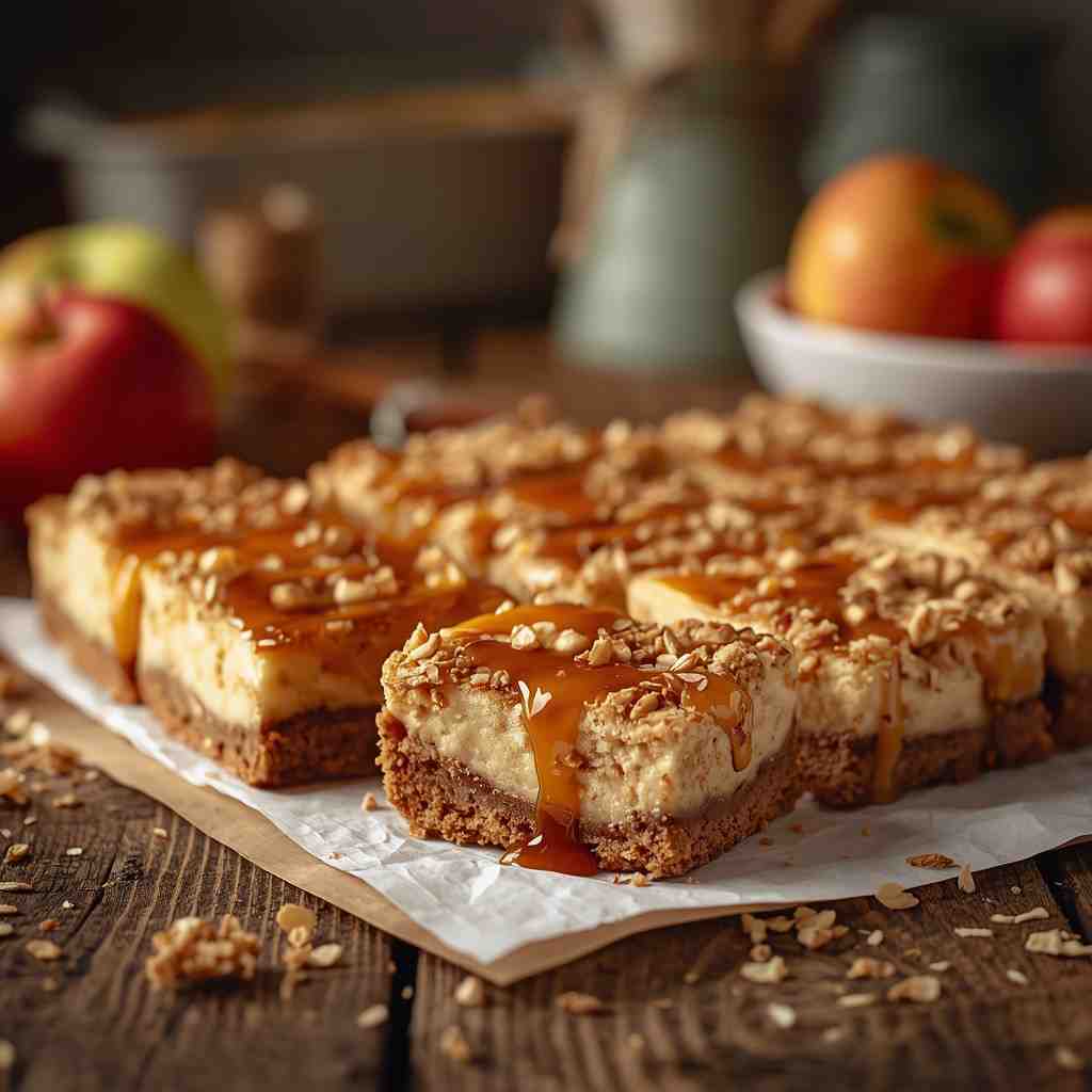 Apple Cinnamon Cheesecake Bars with Caramel Drizzle