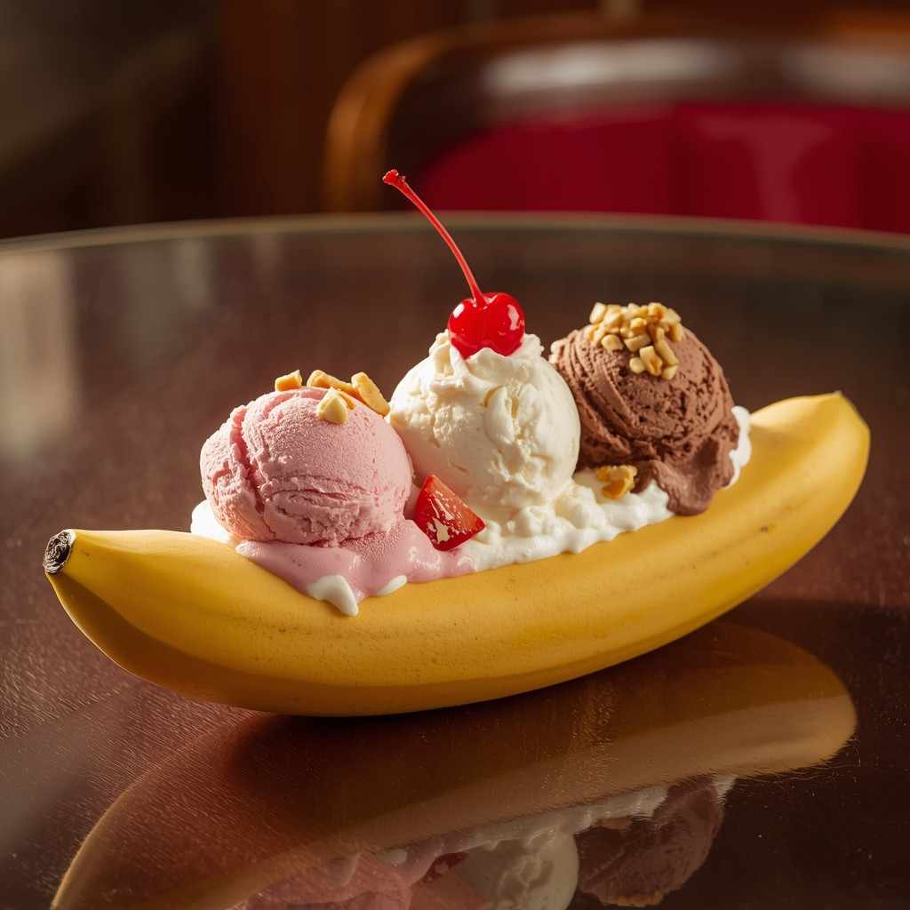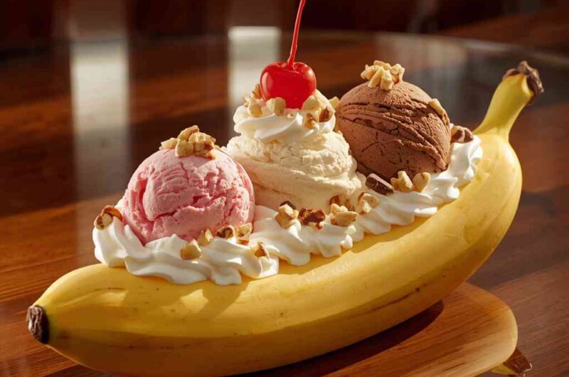 Few desserts evoke as much nostalgia and joy as the classic banana split — a true American ice cream parlor icon. It’s the perfect trio of creamy vanilla, rich chocolate, and fruity strawberry ice cream, nestled between a split ripe banana, drizzled with decadent sauces, and topped with whipped cream, chopped nuts, and a bright maraschino cherry.