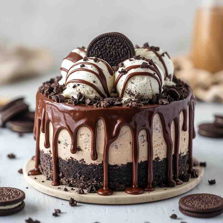 - Step 5: Decorate and Serve : Remove the cake from the freezer 10–15 minutes before serving to soften slightly. Drizzle the chocolate sauce over the top in swirls or zigzags. Garnish with mini Oreos, crushed Oreos, or chocolate curls. Slice and serve immediately!