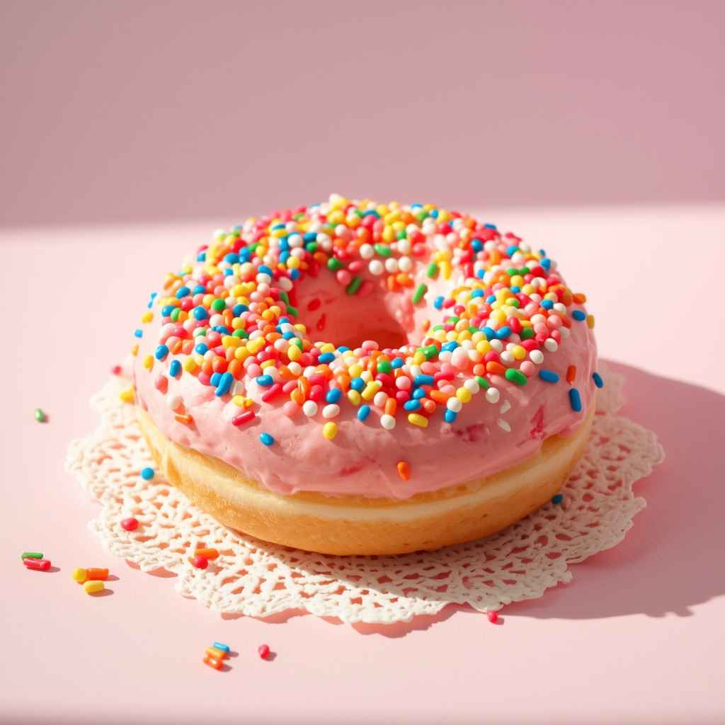 - Dip cooled donuts into strawberry glaze, then sprinkle with rainbow sprinkles. Allow glaze to set.