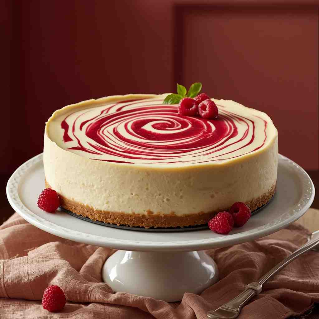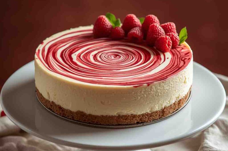 This White Chocolate Raspberry Swirl Cheesecake is elegance in dessert form — a creamy, dreamy fusion of rich white chocolate and vibrant raspberry swirls that adds both beauty and fresh berry flavor to every single bite. Each slice looks like a piece of art, marbled with luscious raspberry ribbons over a silky white chocolate cheesecake filling and a buttery cookie crust.