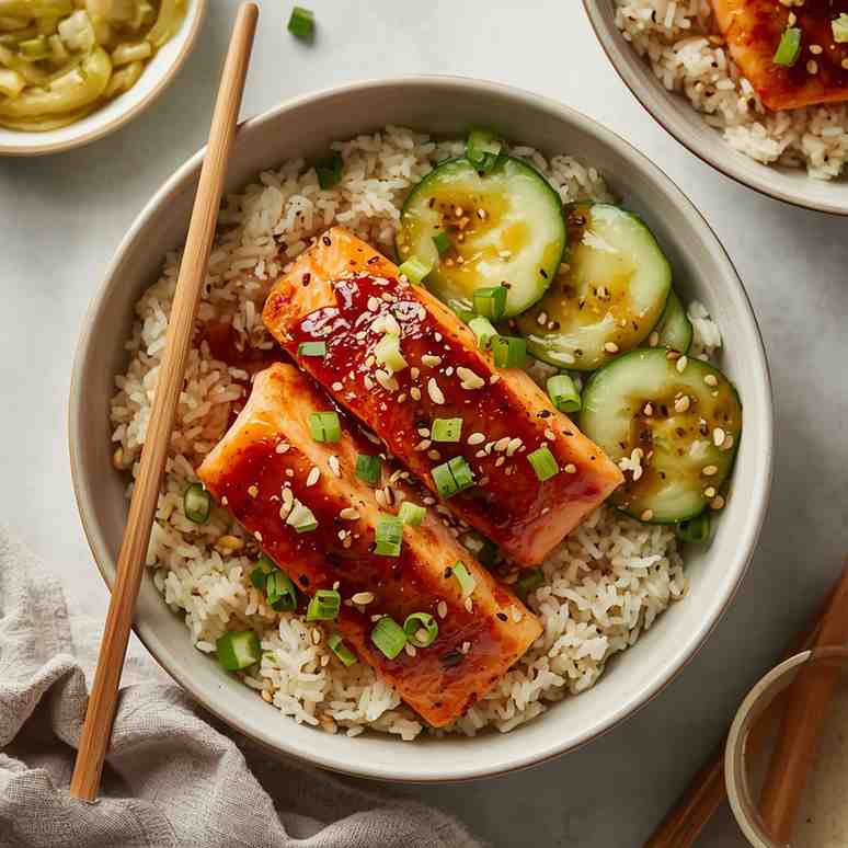 - Step 5: Assemble the Bowls : Spoon jasmine rice into serving bowls. Top each with a glazed salmon fillet. Add a portion of pickled cucumbers on the side. Drizzle any extra glaze over the salmon. Garnish with green onions, sesame seeds, and lime wedges.