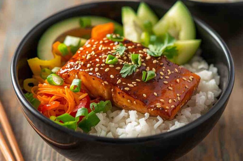 The glaze is a perfect balance of soy sauce, honey, ginger, and garlic — creating a glossy coating that clings to the salmon and caramelizes slightly as it cooks. When paired with jasmine rice and crisp veggies like cucumbers, carrots, or edamame, the dish becomes a wholesome yet indulgent experience.