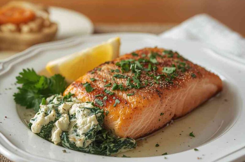 If you’re looking for an elegant yet effortless seafood dish that feels restaurant-quality, this Baked Salmon with Spinach and Cream Cheese Stuffing will steal the show. Imagine tender, flaky salmon fillets filled with a luscious stuffing made of sautéed spinach, garlic, and creamy cheese — then baked to golden perfection. Each bite bursts with flavor — rich yet balanced, creamy yet fresh.
