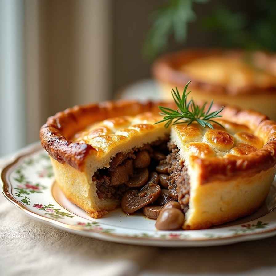 Serve beef and mushroom pie hot, sliced generously. Pair with mashed potatoes, buttered peas, or steamed green beans. A rich gravy or simple green salad makes a great accompaniment.