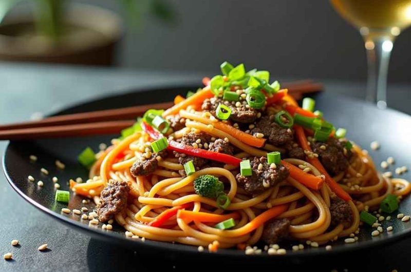 Cook noodles according to package instructions and drain. Toss beef with soy sauce and cornstarch. Heat oil in a skillet or wok, cook beef until browned, then remove. Stir-fry garlic, ginger, and vegetables until crisp-tender. Return beef to the pan, add noodles and sauces, and toss to combine. Serve hot, garnished with green onions and sesame seeds.