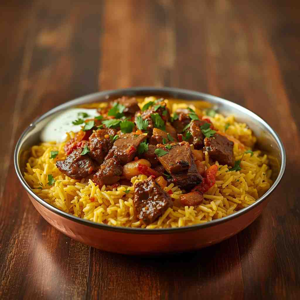 - Layer Biryani: Layer rice and beef, sprinkle herbs, saffron milk.