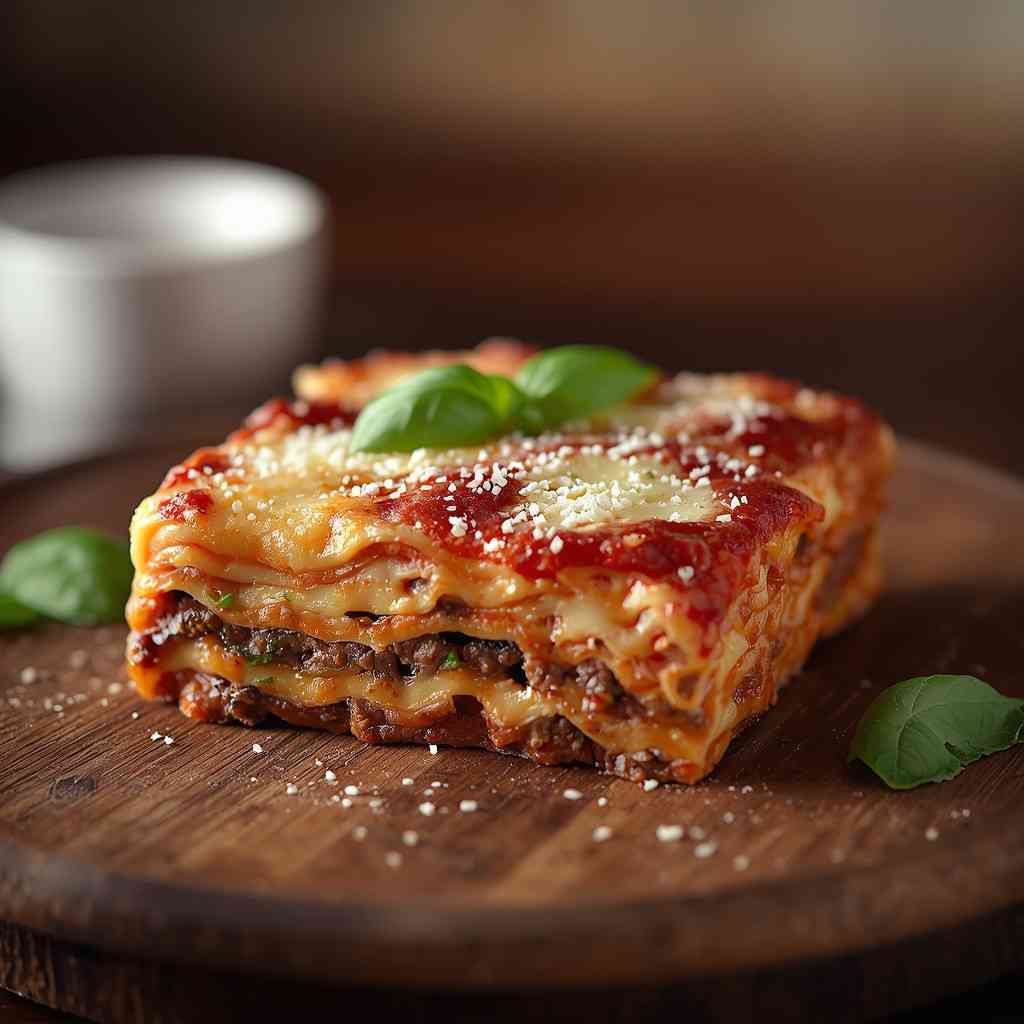 • Step 4: Assemble the Lasagna : Preheat oven to 375°F (190°C). Spread 1 cup of meat sauce on the bottom of a 9×13-inch (23×33 cm) baking dish. Arrange 3 lasagna noodles on top. Spread half of the ricotta mixture over noodles. Sprinkle ½ cup mozzarella. Add 1 cup of meat sauce. Repeat layers (noodles → ricotta → mozzarella → sauce). Finish with a top layer of noodles, remaining sauce, mozzarella, and Parmesan.