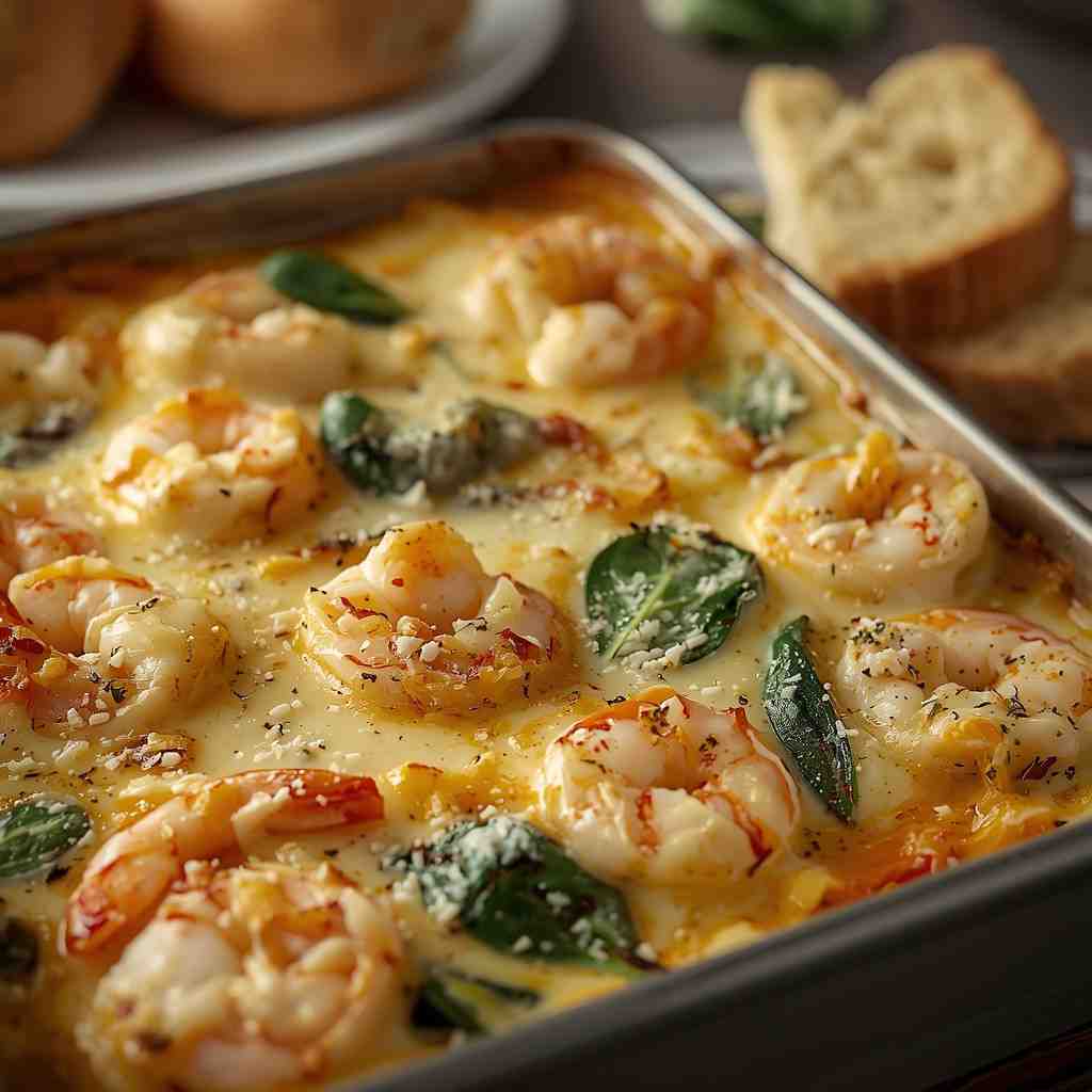 The Cheesy Shrimp and Spinach Alfredo Bake is pure indulgence — creamy, cheesy, and brimming with flavor. Each bite delivers a perfect balance of rich Alfredo sauce, juicy shrimp, and tender pasta, complemented by the freshness of spinach and the irresistible aroma of melted cheese.