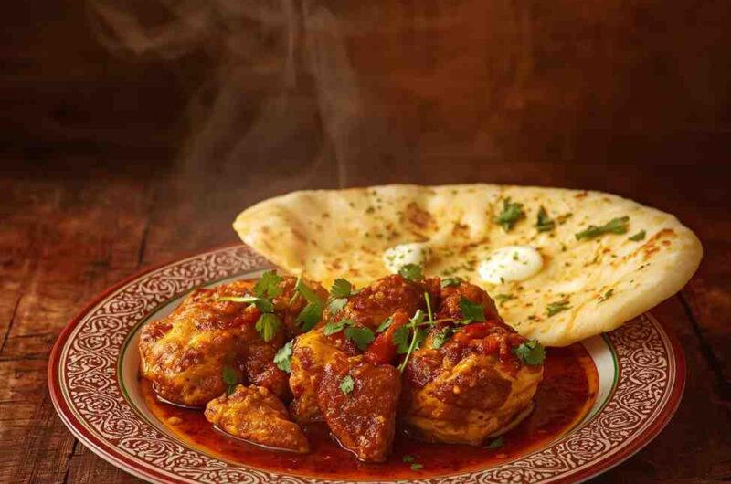Chicken Vindaloo with Garlic Naan is a vibrant, aromatic, and intensely flavorful Indian dish that brings together tender chicken simmered in a spicy, tangy, and rich curry, paired perfectly with warm, garlicky naan bread.