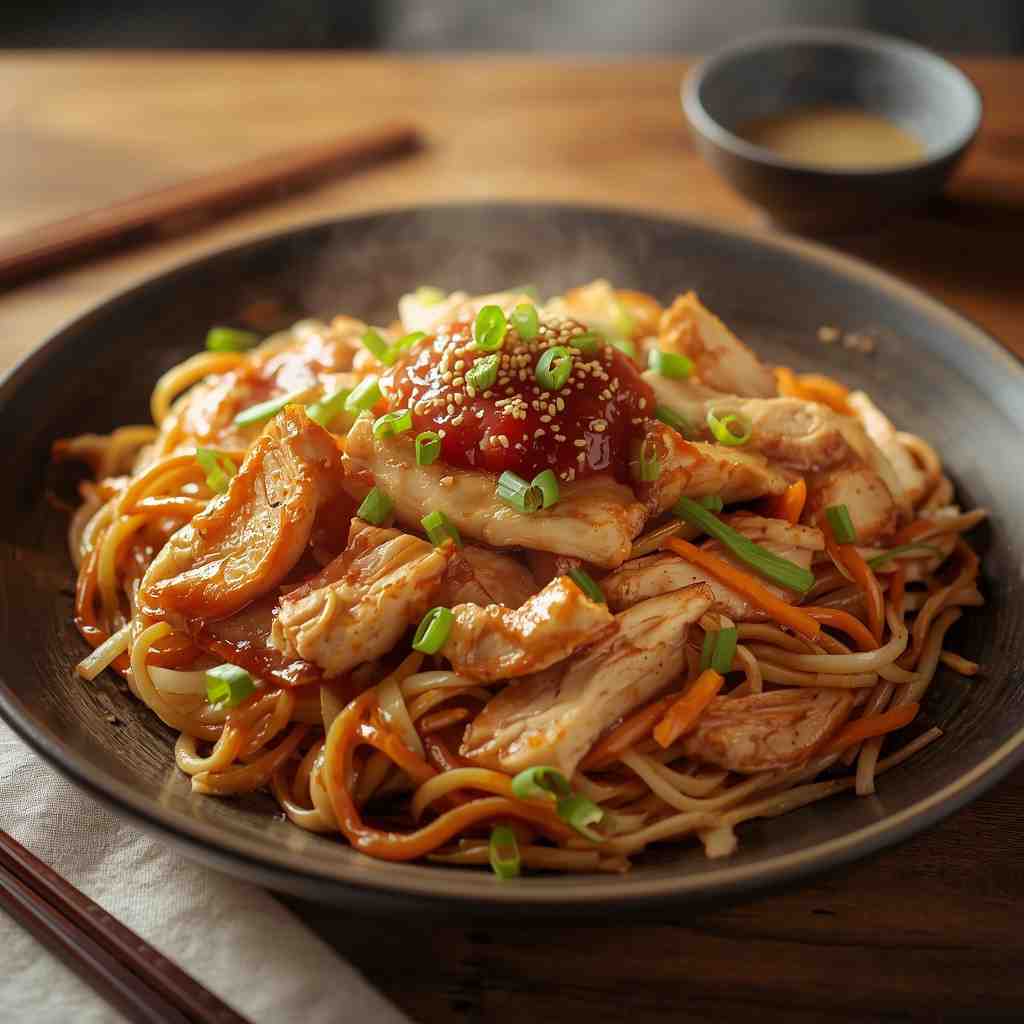 - Step 5: Combine Everything : Return the chicken to the pan. Add the noodles and yakisoba sauce. Toss everything together using tongs or chopsticks until the noodles are evenly coated in sauce and heated through (about 2–3 minutes). Taste and adjust seasoning with more soy sauce or a pinch of sugar if needed.