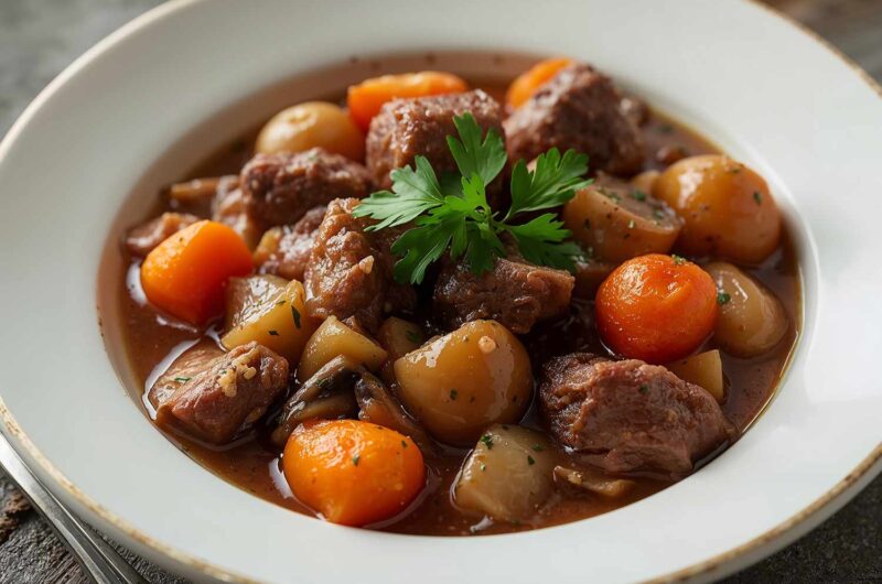 • Combine & Finish: Once the beef is tender, remove bouquet garni. Stir in pearl onions and mushrooms. Simmer for another 10–15 minutes. Taste and adjust seasoning with salt and pepper.