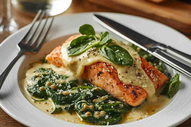 This recipe transforms ordinary salmon into a gourmet experience. The velvety sauce clings to every bite, balancing the natural richness of the fish with a subtle tang from the Parmesan and a burst of freshness from the spinach. It’s an easy one-pan wonder that feels luxurious enough for a date night or family dinner.