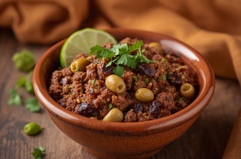 The ground beef provides richness, the briny green olives add a salty punch, and the raisins bring in a touch of sweetness that balances everything out perfectly.