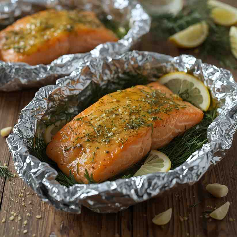 • Step 3: Assemble the Foil Packets : Lay out four sheets of aluminum foil on a flat surface. Place a salmon fillet in the center of each sheet. Drizzle each fillet generously with the garlic butter mixture. Top each fillet with a few lemon slices and, if desired, surround the salmon with vegetables. Fold the sides of the foil over the salmon to create a sealed packet, making sure it’s fully enclosed but with enough space inside for heat circulation.