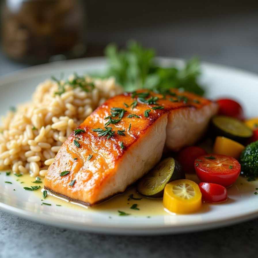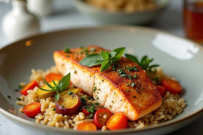 Paired with fluffy, aromatic rice pilaf and colorful oven-roasted vegetables, this dish delivers restaurant-quality flavor right from your home kitchen.