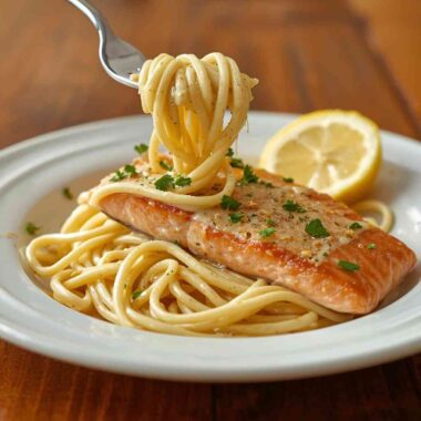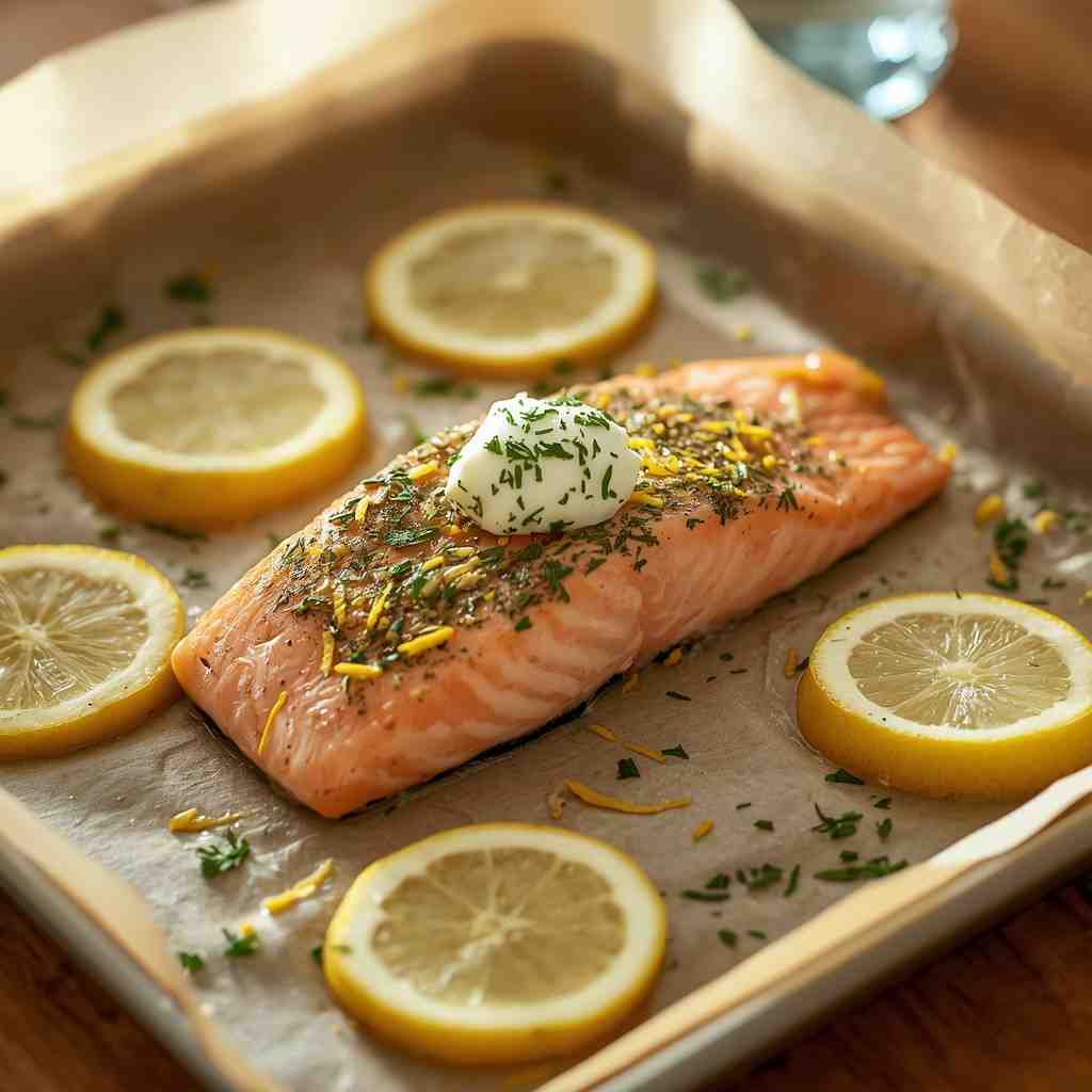 Here, fresh salmon fillets are generously brushed with a homemade garlic herb butter, infused with parsley, thyme, and a hint of dill. Thin lemon slices are layered over the top, infusing the fish with a light citrus perfume as it bakes. The result is juicy, tender salmon that melts in your mouth, with each bite bursting with buttery richness and bright lemony freshness.