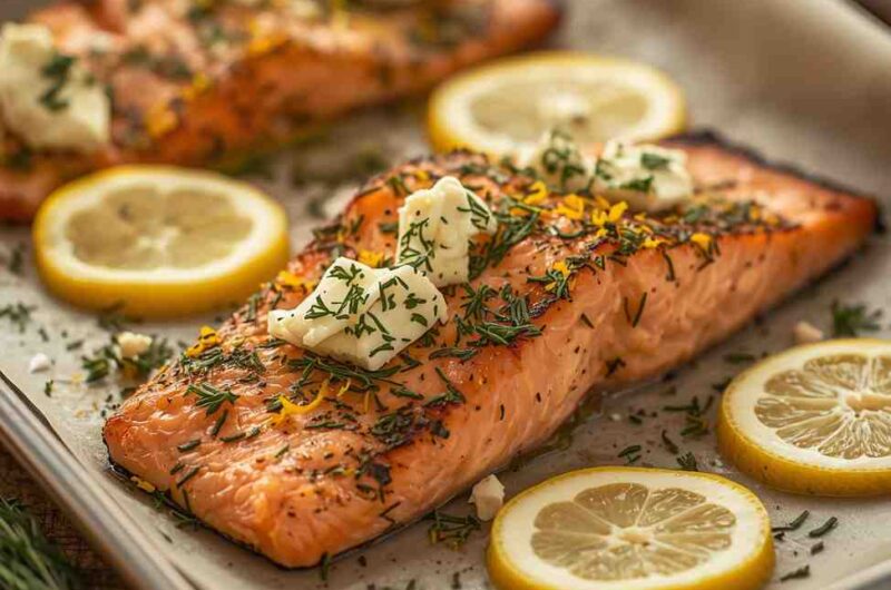 Here, fresh salmon fillets are generously brushed with a homemade garlic herb butter, infused with parsley, thyme, and a hint of dill. Thin lemon slices are layered over the top, infusing the fish with a light citrus perfume as it bakes. The result is juicy, tender salmon that melts in your mouth, with each bite bursting with buttery richness and bright lemony freshness.