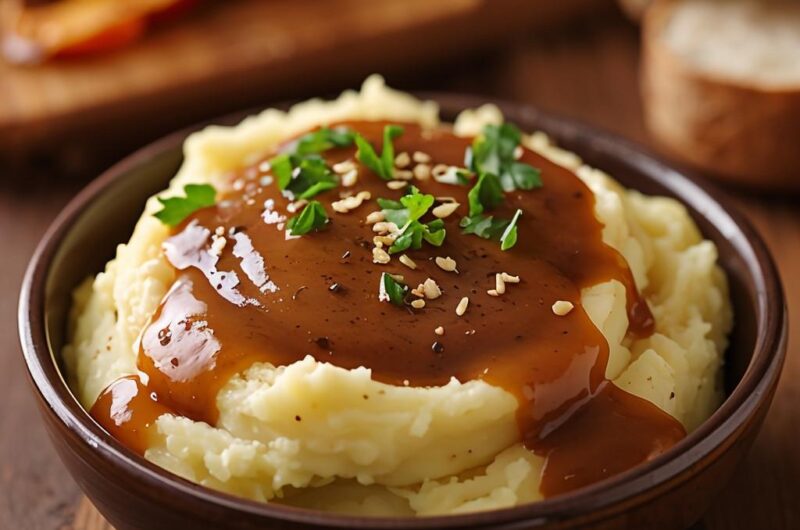 - Loaded Style – Top mashed potatoes with bacon bits, scallions, and shredded cheese before adding gravy.