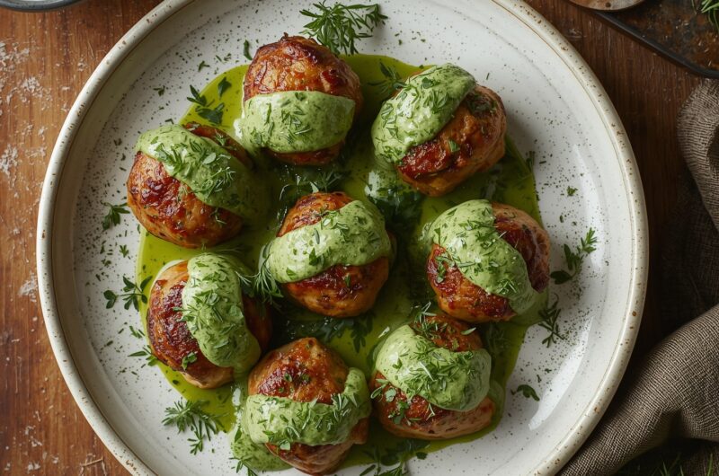 These Green Goddess Chicken Meatballs are packed with fresh parsley, basil, and chives, giving them a fragrant lift and a gorgeous green-speckled appearance. The yogurt sauce complements them perfectly — creamy, cooling, and loaded with even more herbs. This dish feels light yet satisfying, making it perfect for weeknight dinners, meal prep, or even party appetizers.