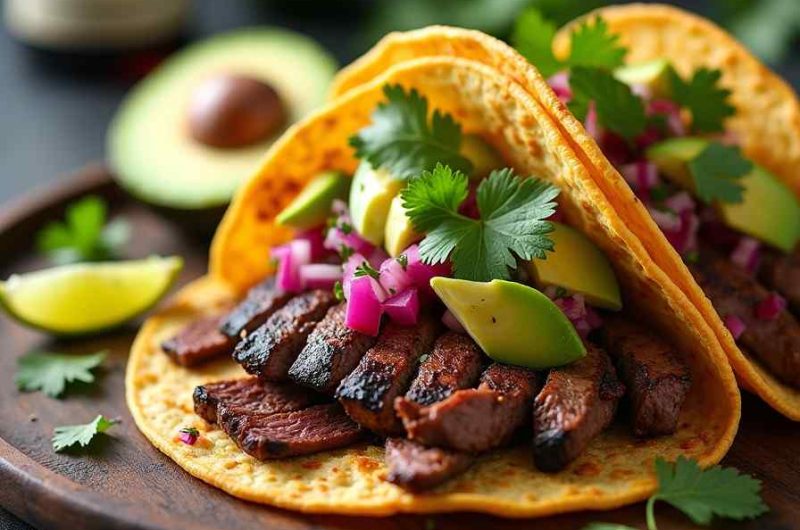 - Assemble tacos with sliced steak and avocado salsa.