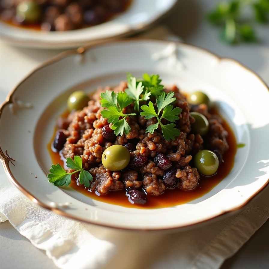 The combination of plump raisins, briny green olives, and aromatic spices creates a complex, comforting flavor profile that is both hearty and satisfying.