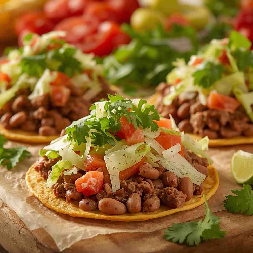 Ground Beef Tostadas with Refried Beans and Lettuce