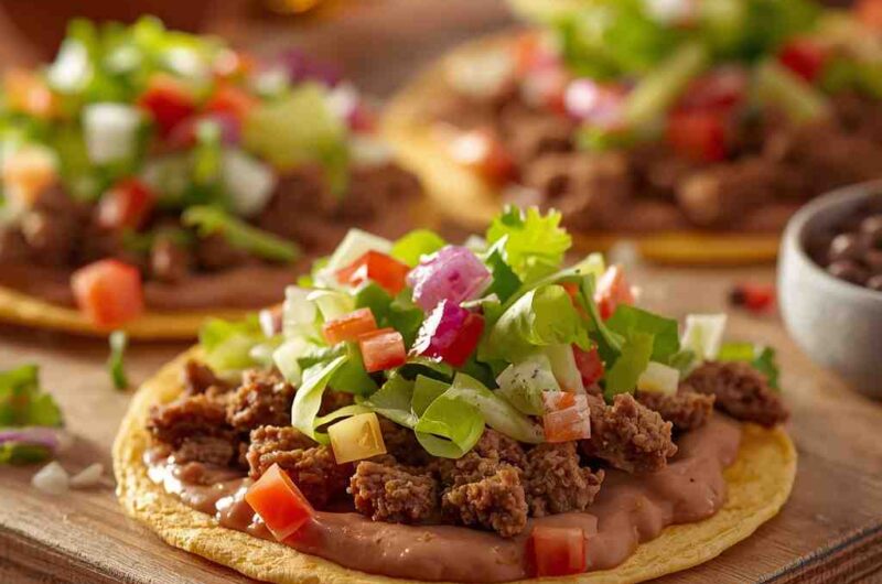 Ground Beef Tostadas with Refried Beans and Lettuce are a classic Mexican-inspired dish that brings together simple ingredients in the most delicious way. Crispy tostada shells create the perfect base for layers of creamy refried beans, seasoned ground beef, crisp lettuce, and fresh toppings.