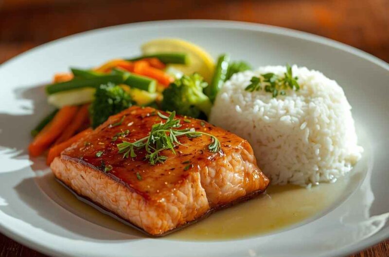 Honey Garlic Salmon with Jasmine Rice and Steamed Vegetables