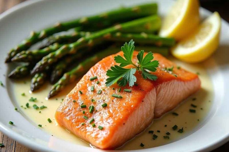 Swap asparagus with green beans, broccoli, or roasted Brussels sprouts. Add capers to the lemon garlic butter for a tangy twist. For a spicy version, sprinkle red pepper flakes on the salmon before baking. Drizzle a little honey over the butter sauce for a sweet and savory variation. You can also bake the salmon and asparagus together entirely in the oven with the garlic-lemon butter brushed on top for a hands-off version.