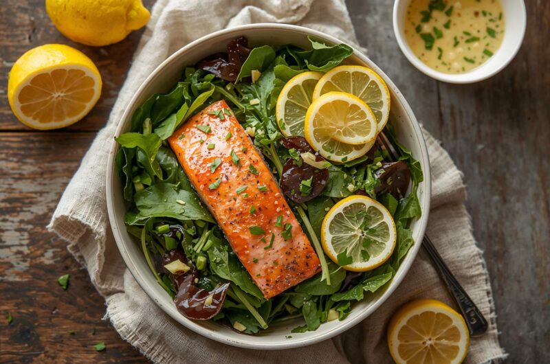 - Step 5: Assemble the Bowls : Drizzle the dressing over the salad and toss lightly. Place the cooked salmon fillet on top of each salad bowl. Garnish with fresh parsley or extra lemon slices.