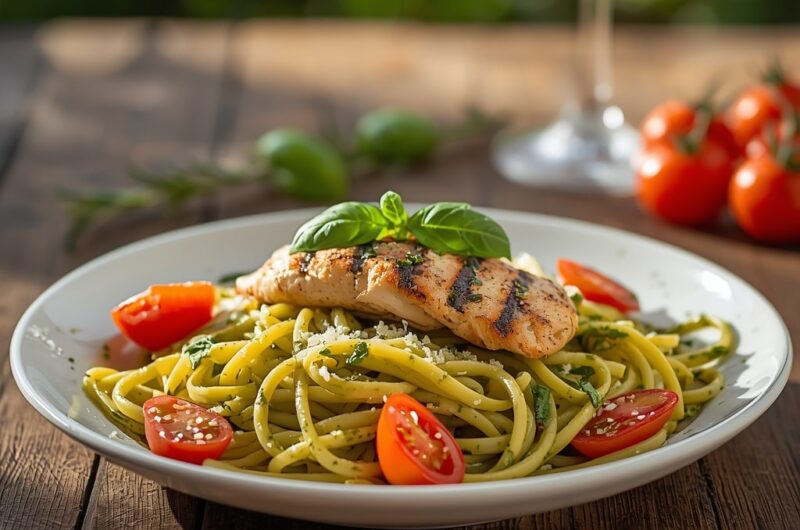Fresh, vibrant, and bursting with flavor, Pesto Pasta with Grilled Chicken and Cherry Tomatoes is a dish that brings together the best of summer-inspired cuisine. Tender pasta is tossed in a fragrant, herbaceous basil pesto, while juicy, perfectly grilled chicken adds protein and a smoky depth.